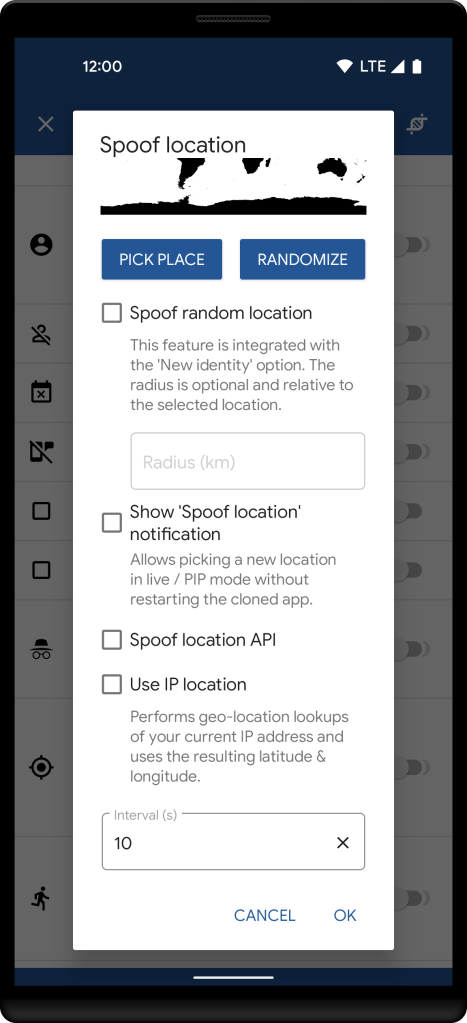 Enable Show ‘Spoof location’ notification to show a notification, which allows picking a new location in live / PIP mode without restarting the cloned app (this feature is not available in the Huawei version of App Cloner).