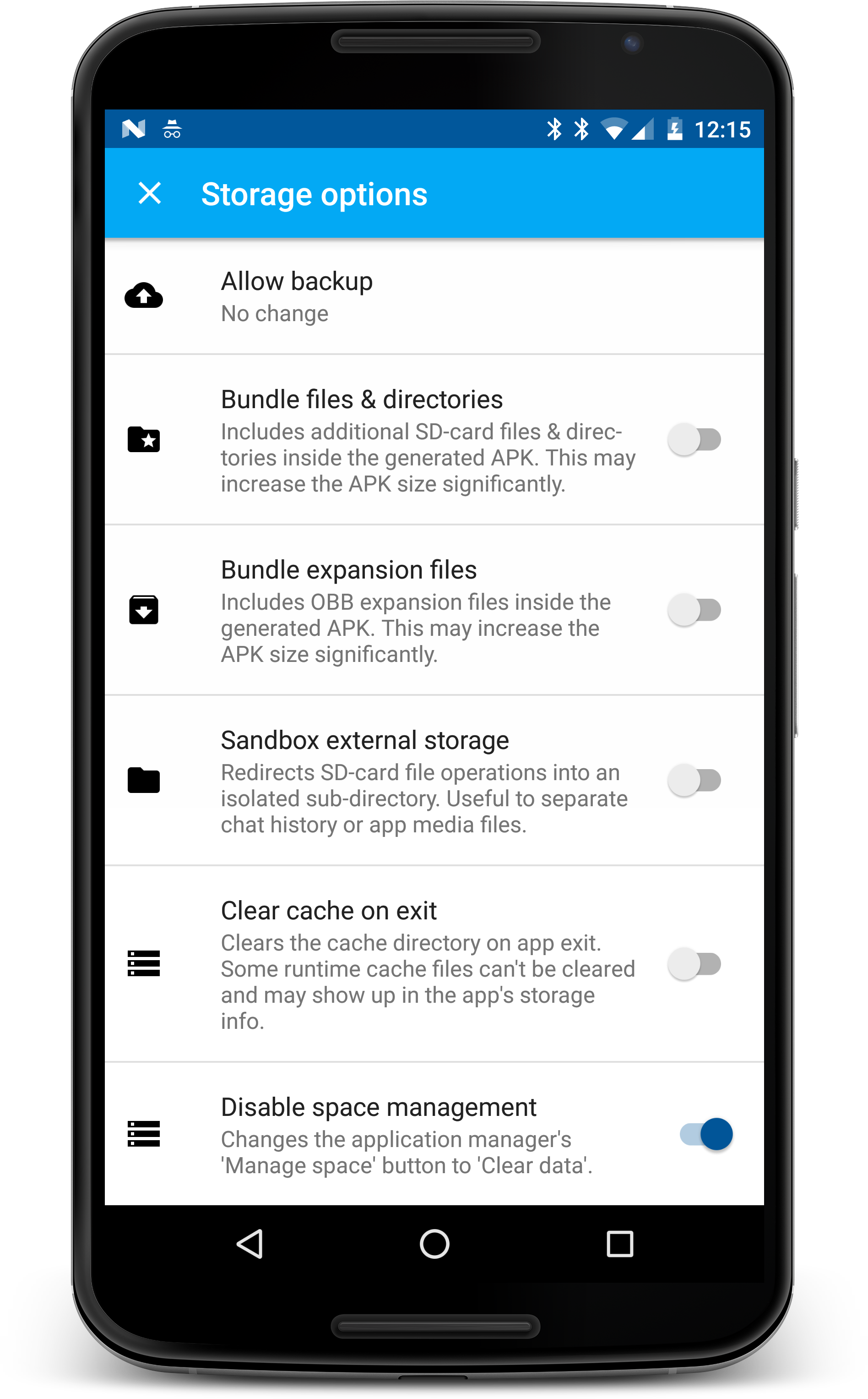 The storage option Disable space management prevents apps from hijacking the Clear data button.