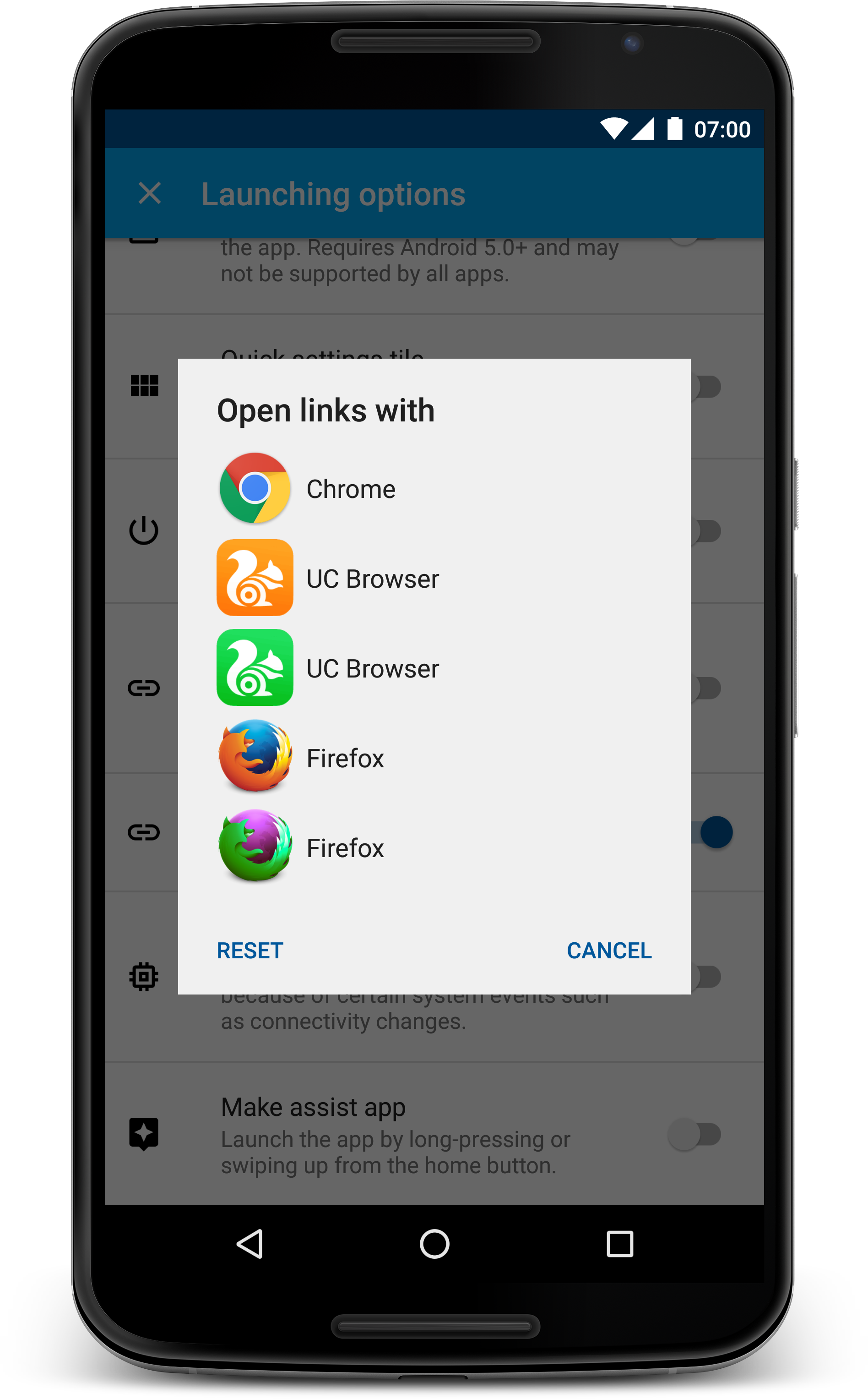 The upcoming ‘Open links with’ launching option allows you to set the default browser for handling external links opened by the cloned app. This prevents the app chooser popping up if you have multiple browser apps installed.