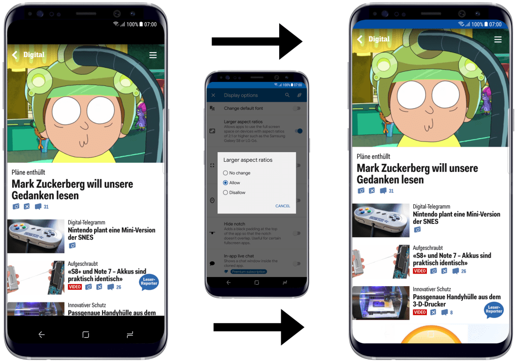 The Larger aspect ratios display option allows removing the default aspect ratio restrictions Android imposes on apps that were not designed for tall displays. Useful for modern Samsung devices.