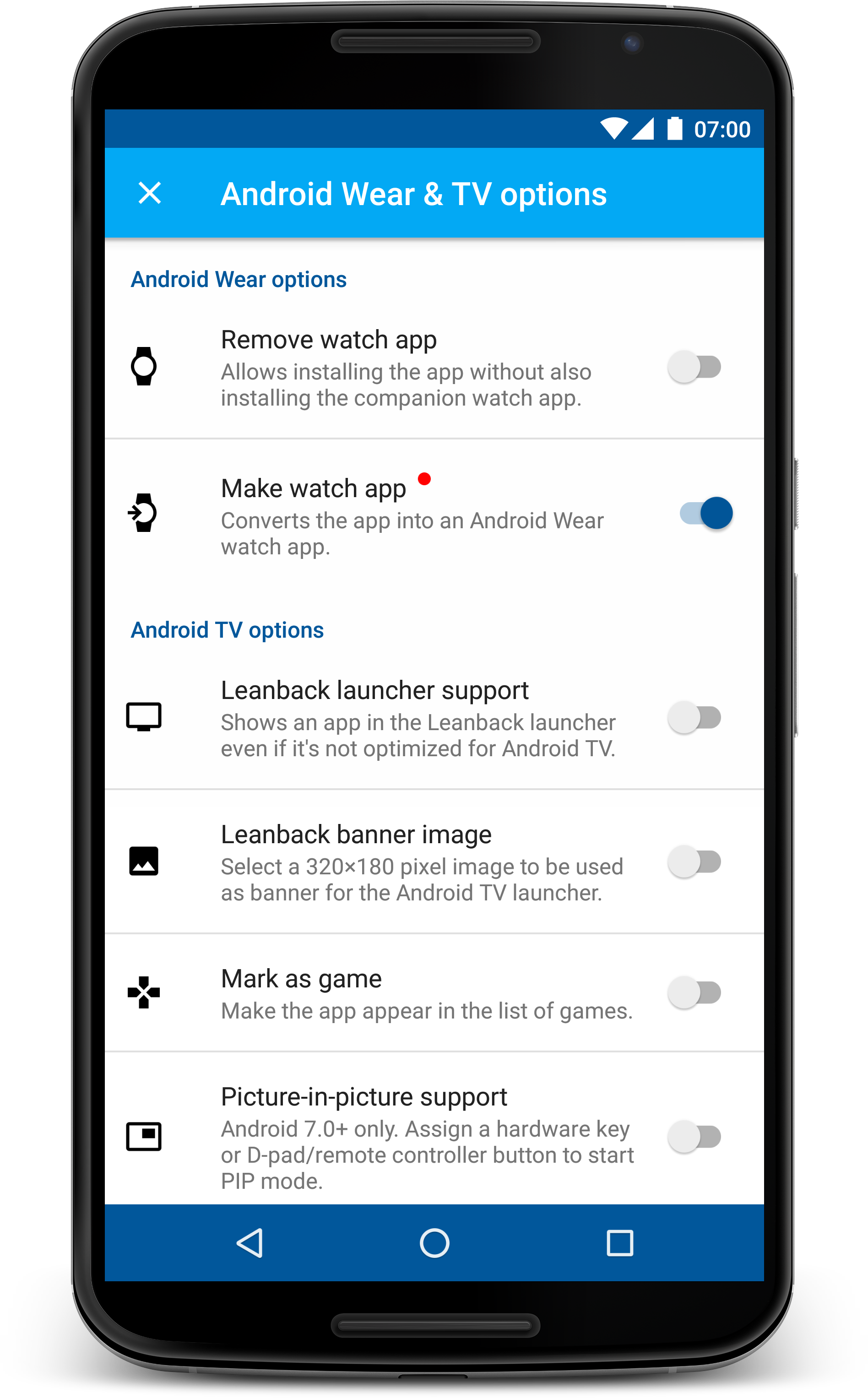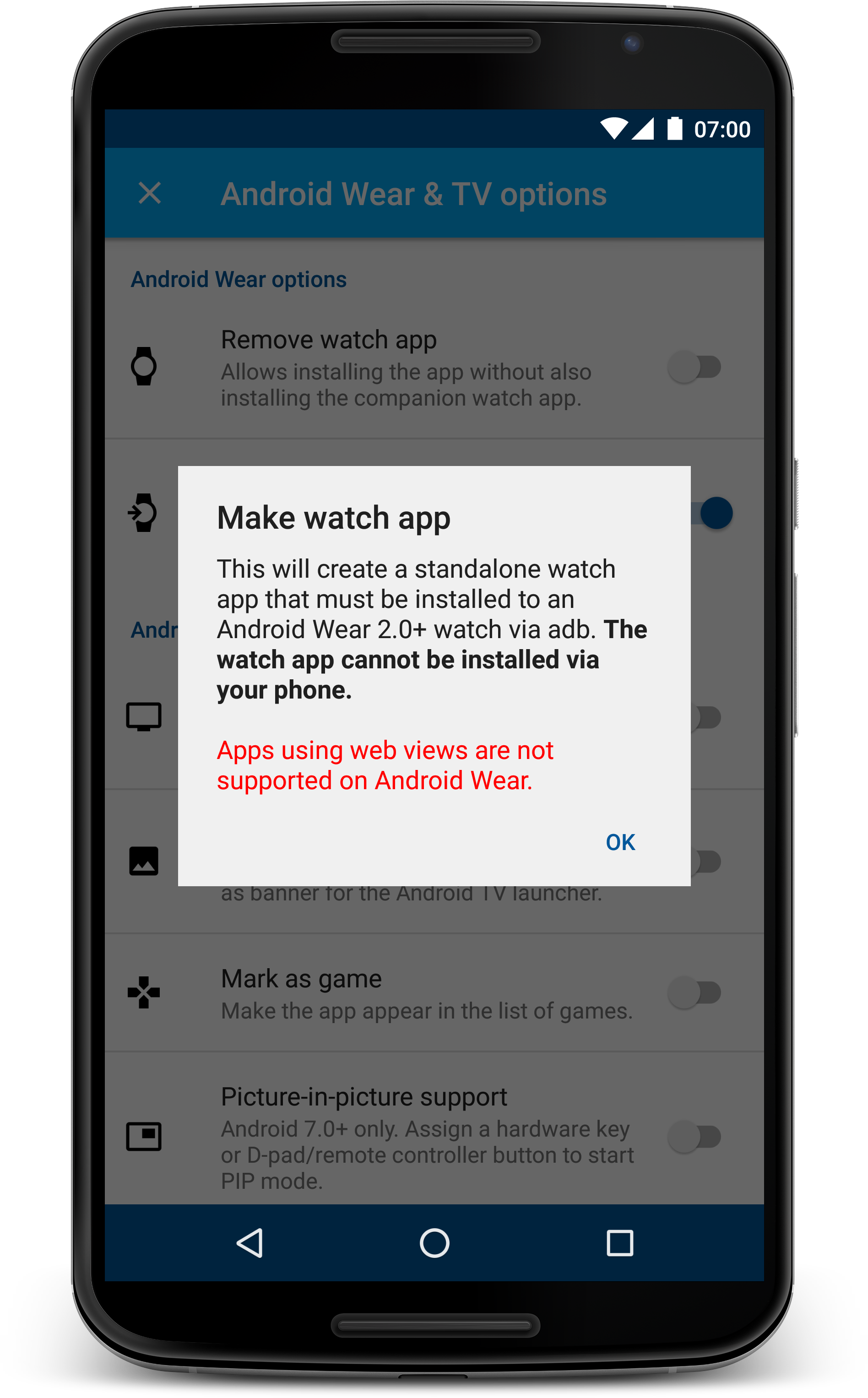 Need a file manager for your watch? Here’s the new ‘Make watch app’ option and a clone of Solid Explorer running on Android Wear. Actually, very few apps seem to work. Any app that uses web views will crash, so that rules out many apps that display ads.