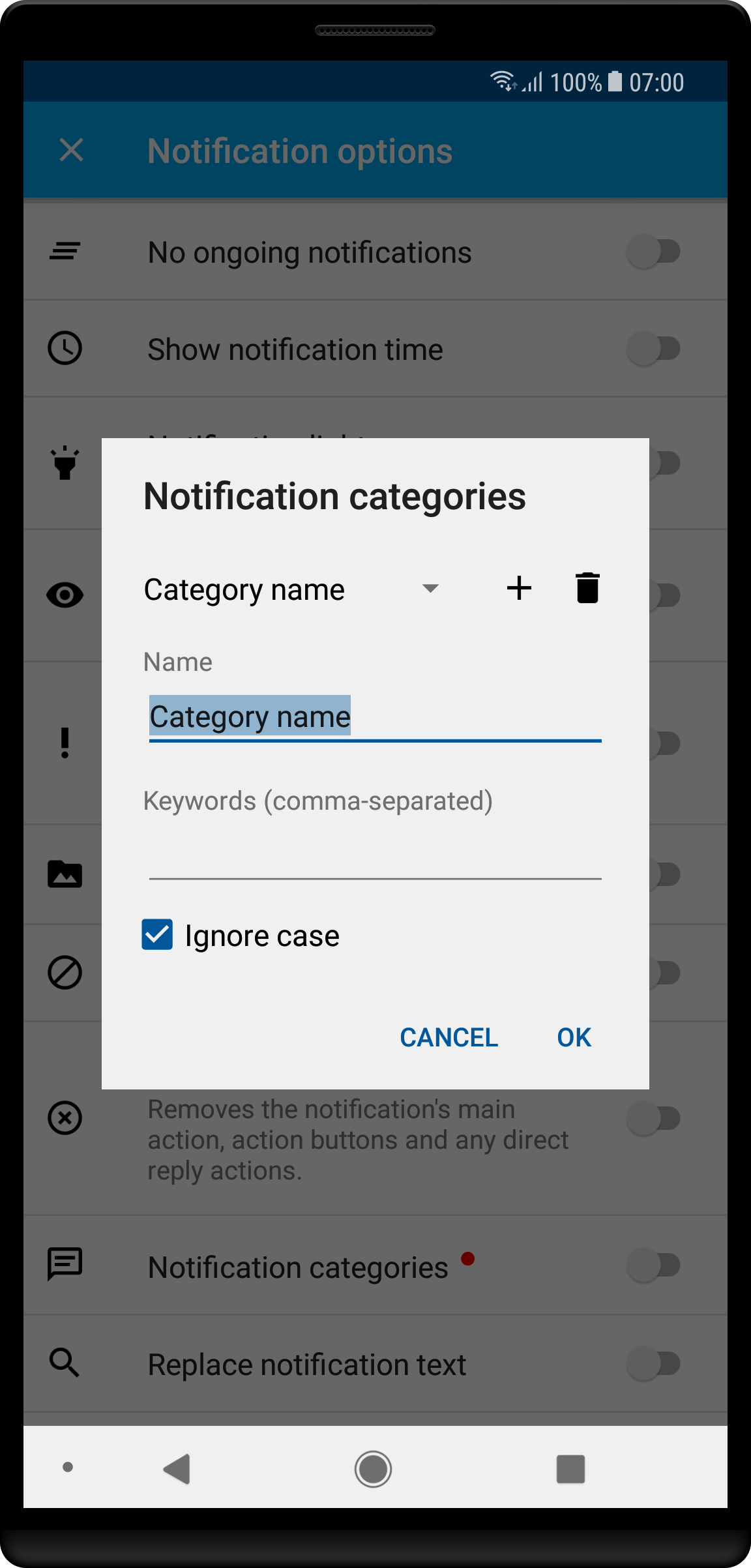 Requested by many, App Cloner 1.4.15 will support Android 8.0 notification channels via the Notification categories option. You can link specific keywords in the notification text (like contact names) to individual notification categories and the Android notification system will then allow you to configure the notification category importance, sound, vibration and other attributes.