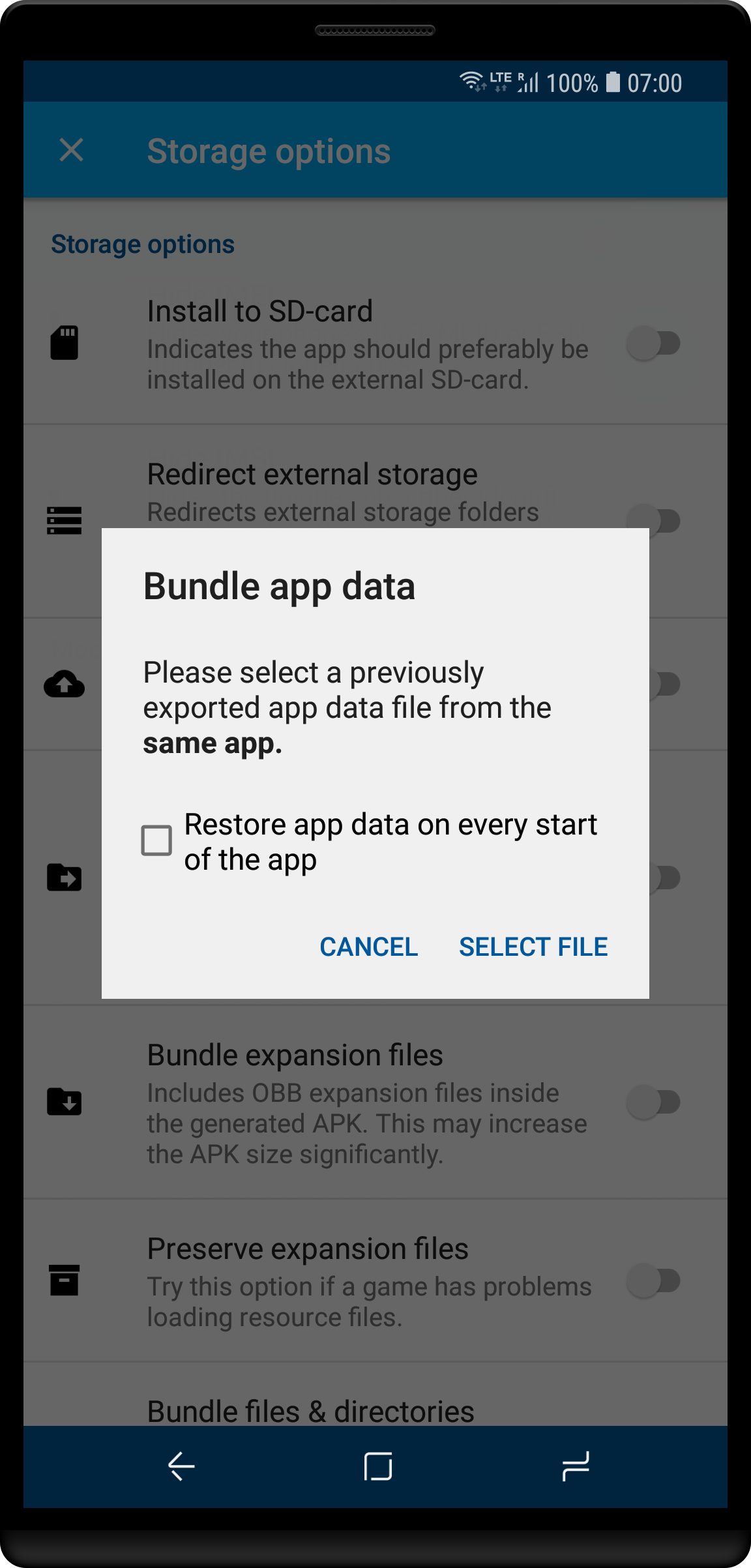 The Bundle app data storage option allows you to include previously exported app data inside the generated APK. This app data will be set as initial / default app data when starting the app after installation or when clearing the app’s data. This means you will be able to generate an APK, which already ships with your preferred settings, configurations or possibly login sessions, cookies, etc.