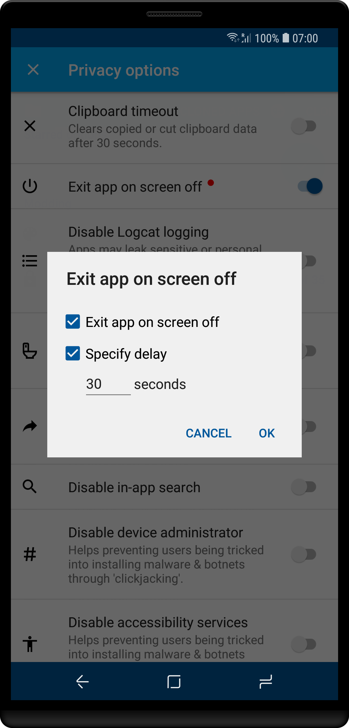 As requested, the delay for the option Exit app on screen off will be available in App Cloner 1.5.15.