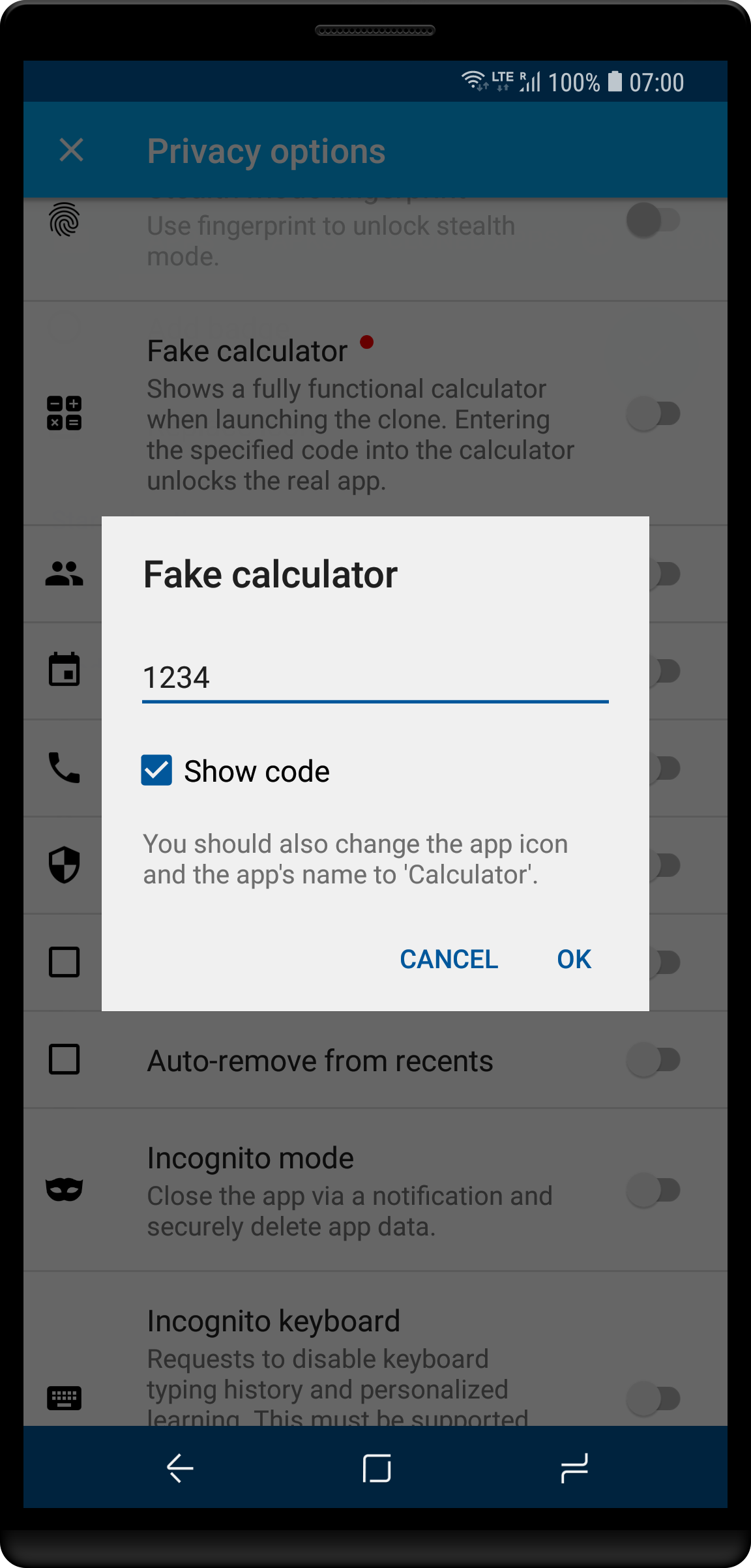The Fake Calculator privacy option shows a simple but fully functional calculator app when launching the clone. If you enter the correct code it will unlock the real app. Obviously, it makes sense to also change the app’s name and icon to something resembling a calculator app 🙂
