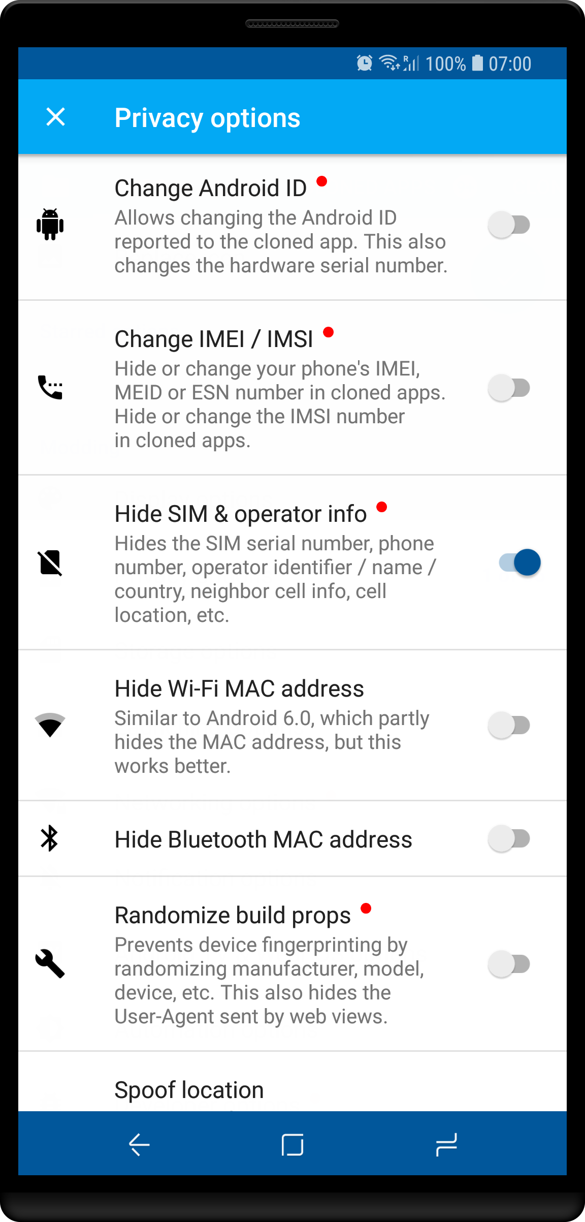 The Hide SIM & operator info privacy option hides a whole range of personal information from cloned apps: your SIM card’s serial number (SSN), your SIM card’s phone number (some SIM cards still allow this to be read), your carrier / operator identifier, the operator name and country as well as neighbor cell tower information and current cell tower location. Basically it covers a good proportion of information provided by the Android telephony provider, including the very latest Android 9 Pie APIs.