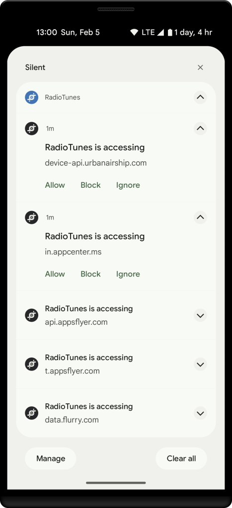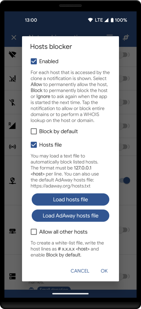 The Hosts blocker networking option is a very powerful privacy tool to monitor and block individual hosts or entire domains a cloned app accesses. Once enabled, the cloned app will show a notification for each host that is being accessed, allowing you to allow, block or ignore the host.