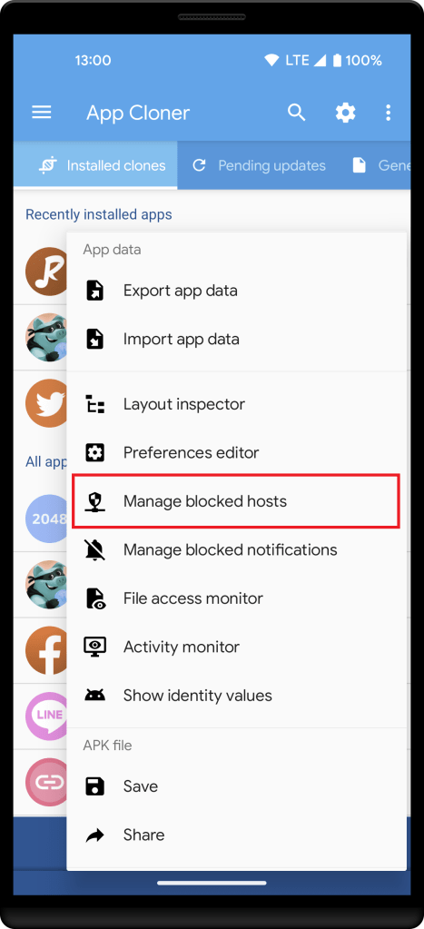 In case you accidentally blocked a host, you may configure blocked hosts using Manage blocked hosts from the pop-up menu under the Cloned apps tab.