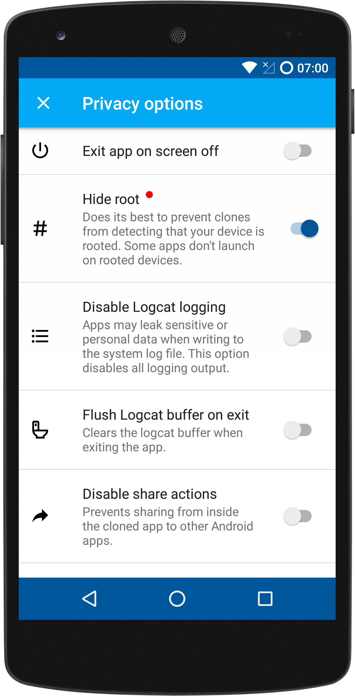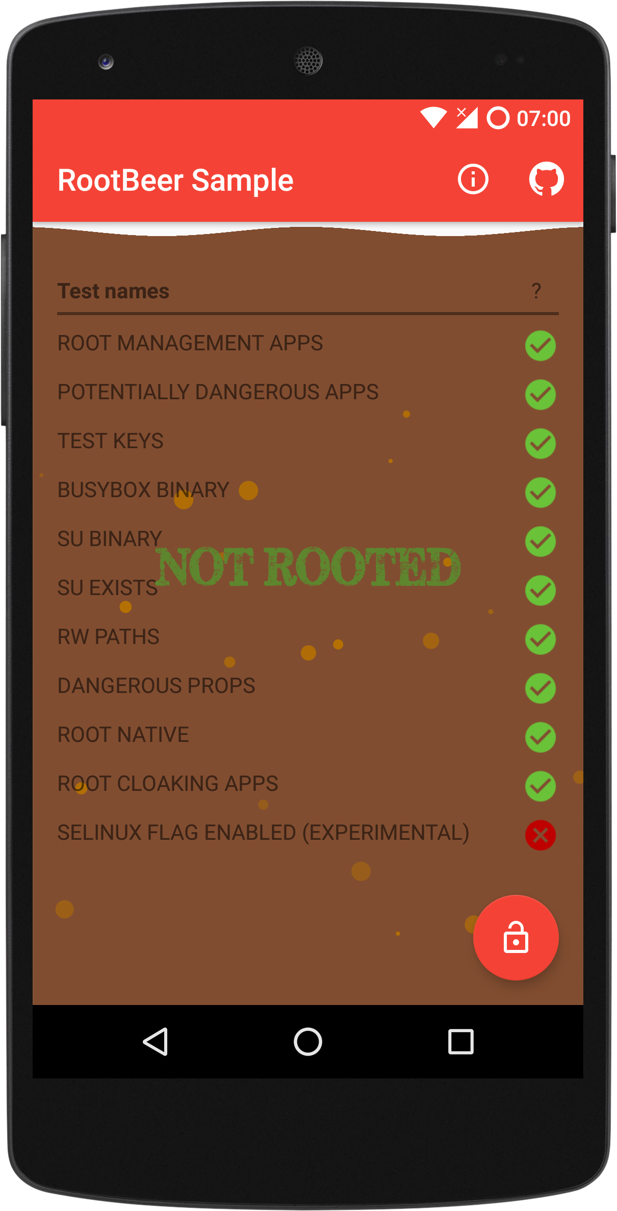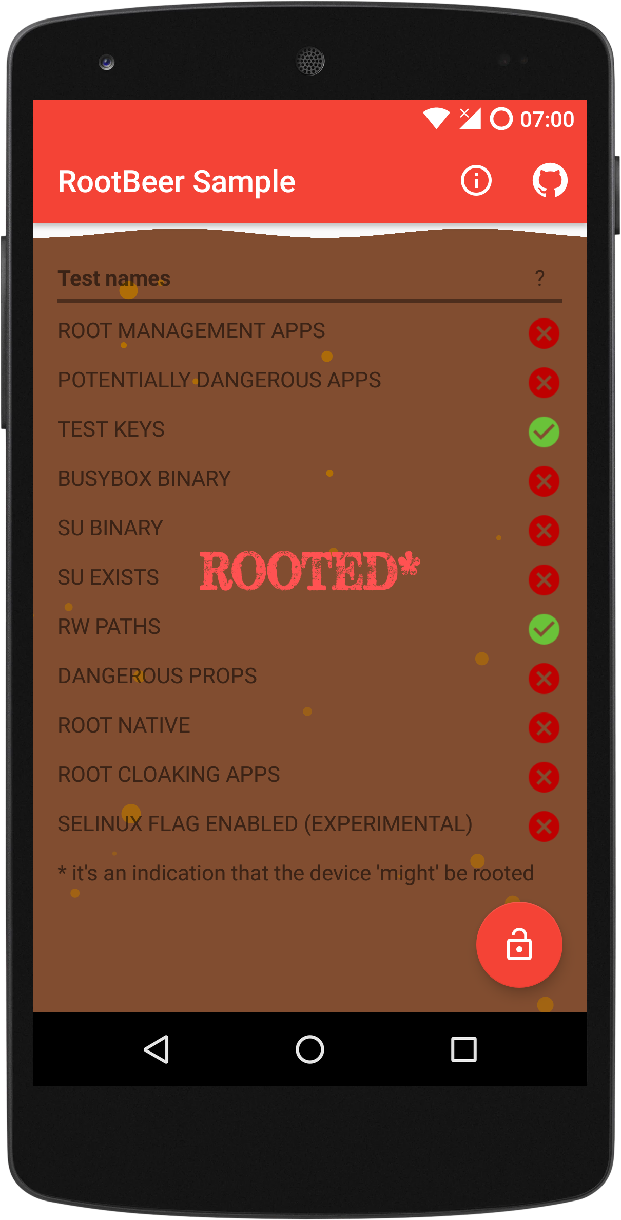 The Hide root privacy option disables common root checks inside the cloned app. These screenshots are from the RootBeer sample app, which showcases a library that implements multiple root detection methods.