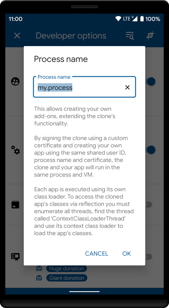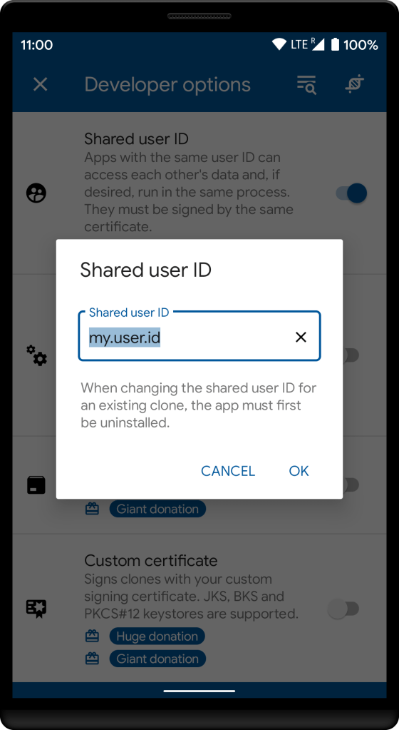 The Shared user ID developer option allows generating clones with a specific shared user ID, an arbitrary string value, which must contain at least one ‘.’ separator. Apps with the same shared user ID can access each other’s data and, if desired, run in the same process, provided the apps are also signed with the same certificate.