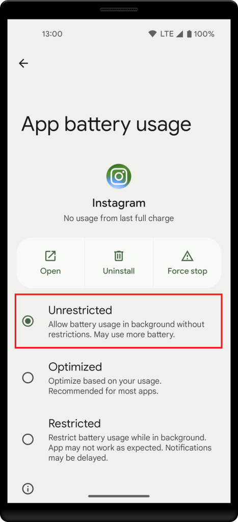 To fix this, try excluding the cloned app from the battery optimizations in the Android system settings. Under the Installed clones tab open the app’s context menu and select Show app info > App battery usage and then select Unrestricted.