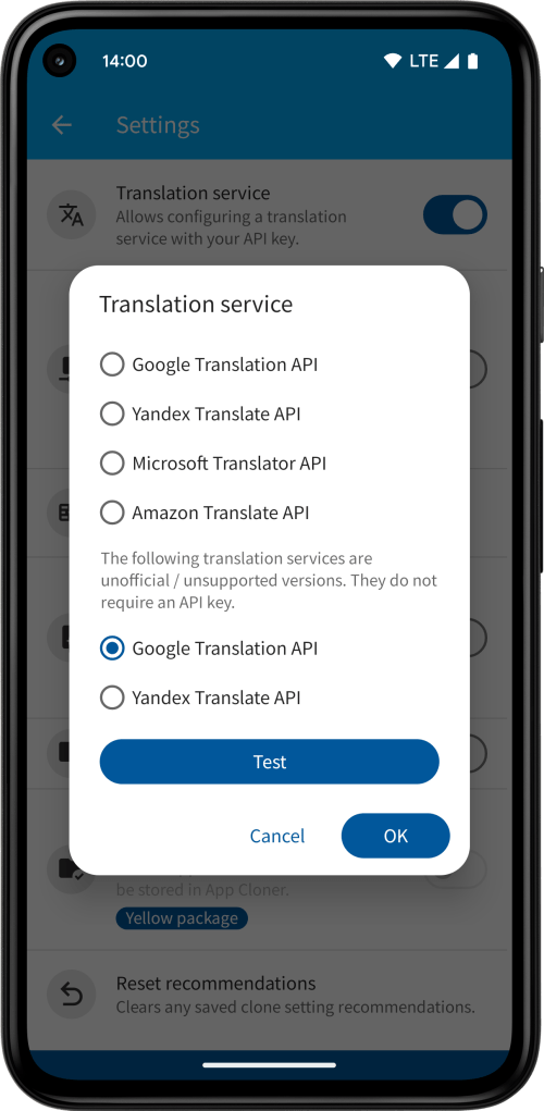 App Cloner also supports unofficial access to Google and Yandex translation APIs without an API key, though these may not always work reliably or may be rate-limited.