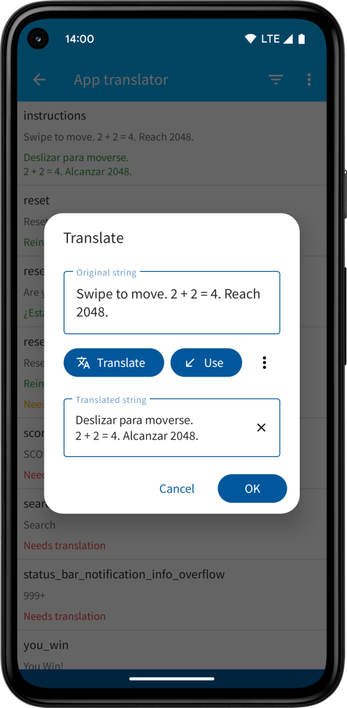 Tap Use to copy the original string into the translation field. This is handy for strings that don’t require translation or need only small edits.