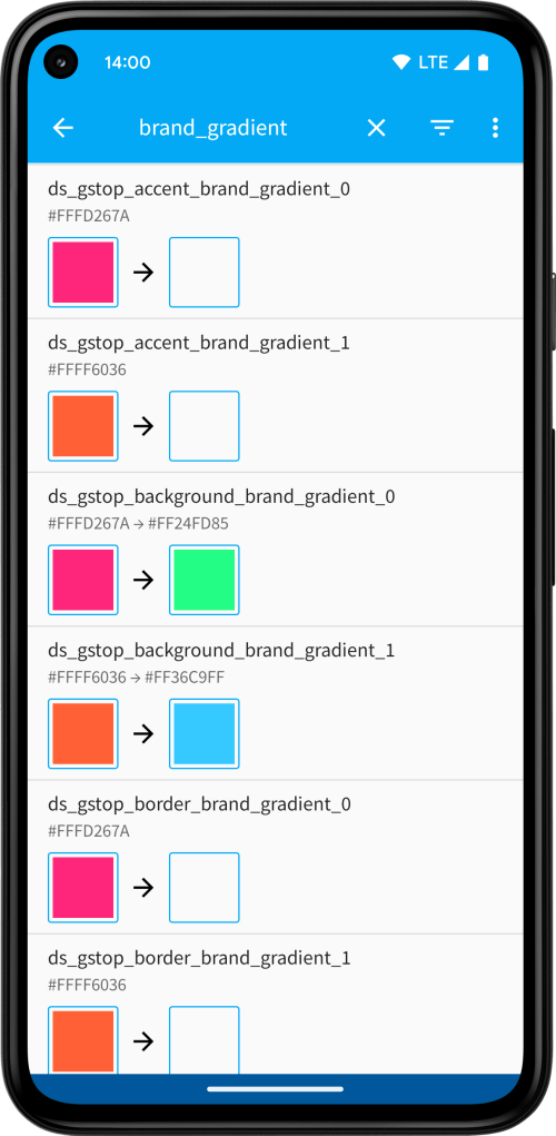 The color editor allows replacing resource-based color definitions. Each color definition has a unique name and may reference another color definition or color selector, or it may declare a color code in hex format (#AARRGGBB), which can be previewed in the left square. Color definitions that reference color selectors cannot be previewed in the editor.