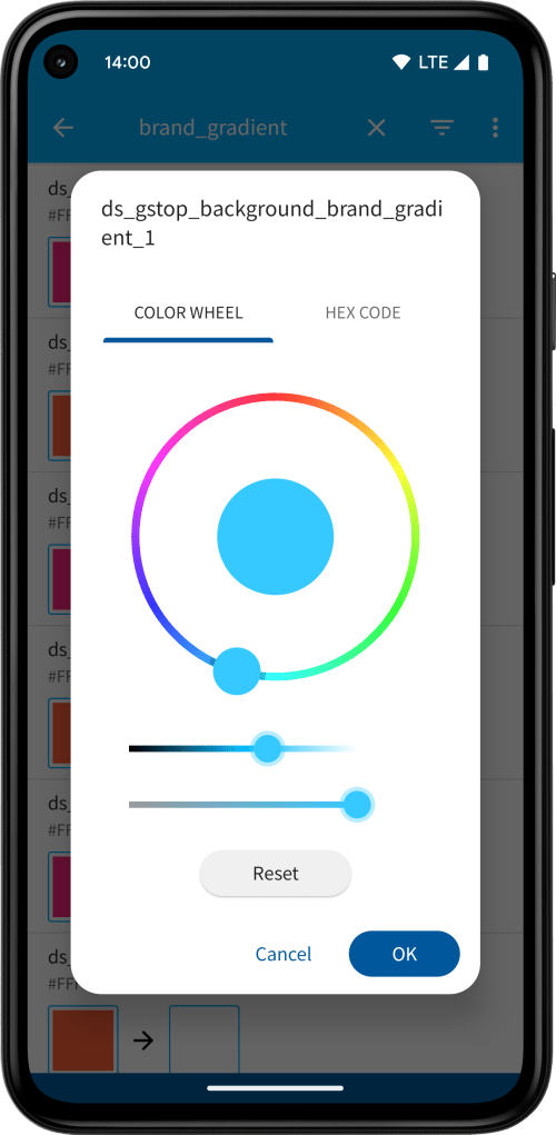 Tapping a color definition opens the color picker where you can use a color wheel to select a replacement color. This can then be previewed in the right square. The color editor also allows entering a specific color code in hex format by switching to the Hex code tab.