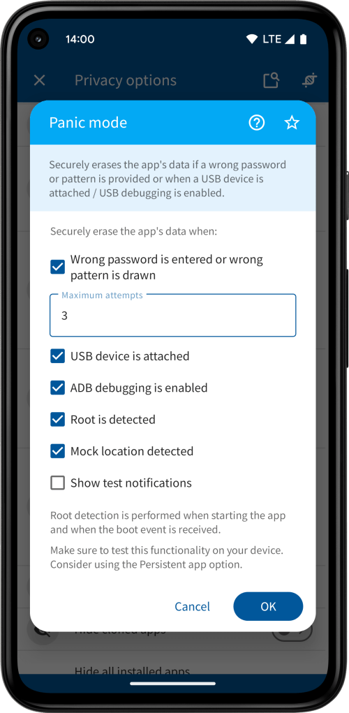 Since this functionality depends on certain system events being triggered in a timely manner, it’s highly recommended for you to test the behavior on your device by enabling the Show test notifications checkbox. This shows a notification when the panic mode is activated and the app data is erased. While testing, make sure App Cloner is running.