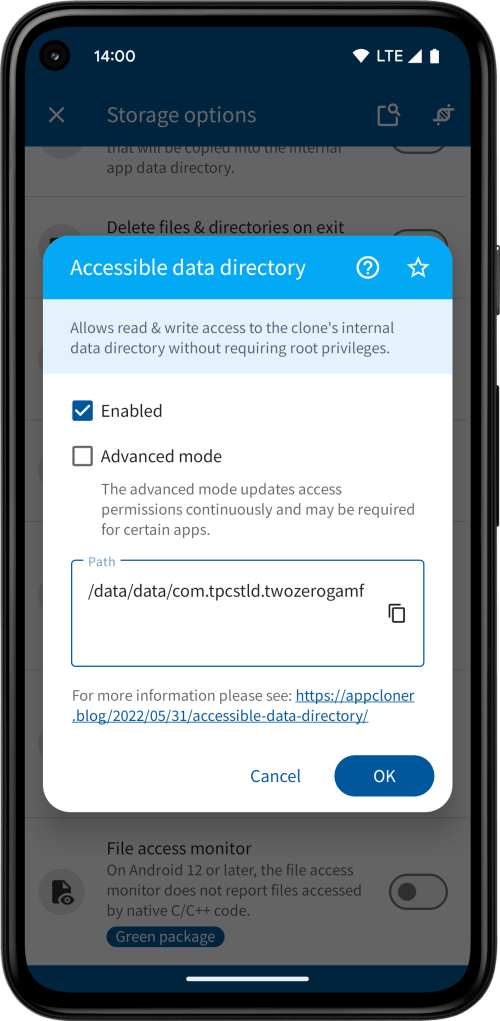You can enable the Advanced mode to continuously update access permissions while the cloned app is active, even when the app is in the background. This can benefit apps that occasionally reset their file permissions. However, use it only when necessary, as it may affect app performance depending on the number of internal files.