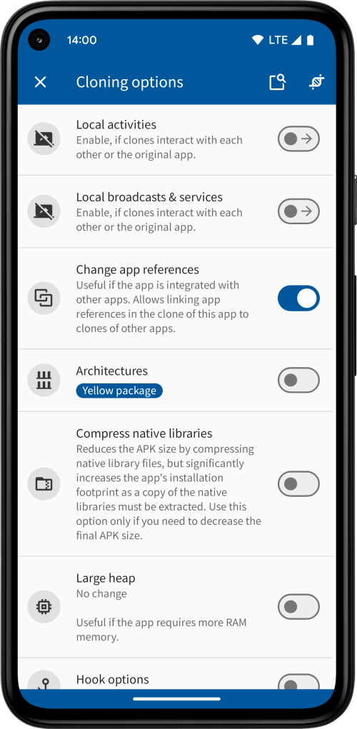 Then you create clones of your desired app and enable the cloning option Change app references, enabling the Chrome app. Once installed, each clone points to its own Chrome browser instance with its individual cookie settings and you may log in using a different Facebook account with each clone.
