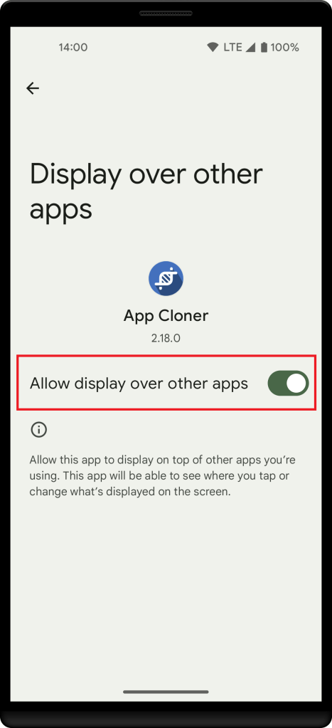 Please note that this API only allows launching cloned apps. On modern Android versions it’s required that you grant App Cloner the Display over other apps special app access permission in the Android settings under Apps. This allows App Cloner to start cloned apps when in the background.