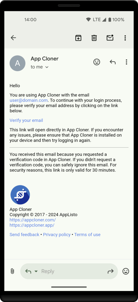 Make sure to safeguard access to your email. See also the App Cloner Terms of Use.