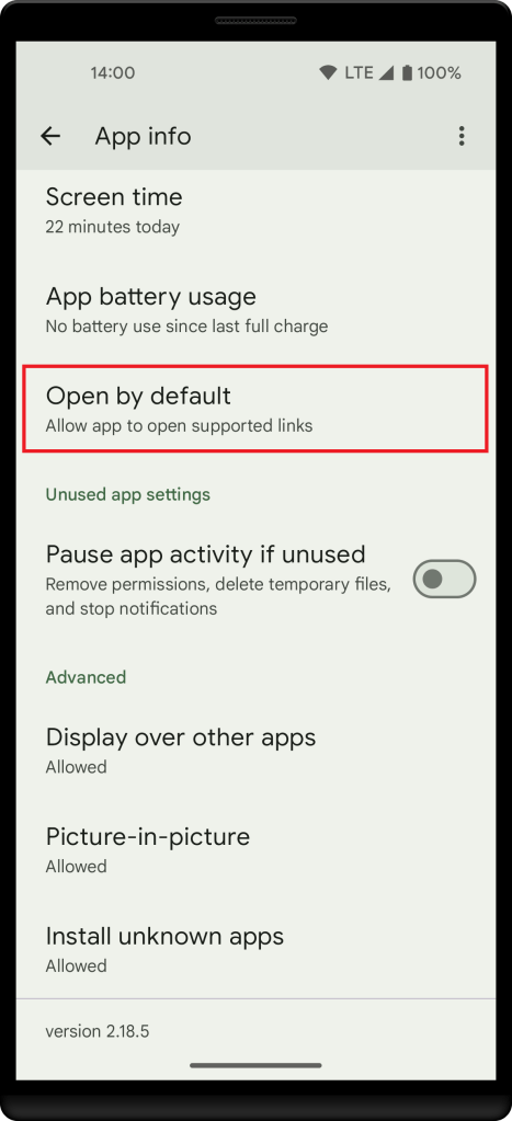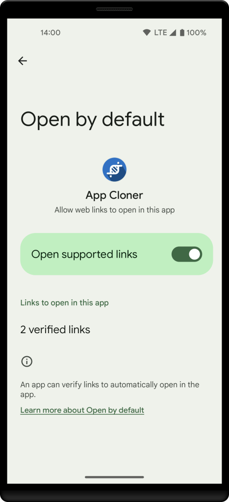 If the link still doesn’t open in App Cloner, please check that App Cloner is properly configured in the Android app settings under Open by default to automatically handle links associated with App Cloner.