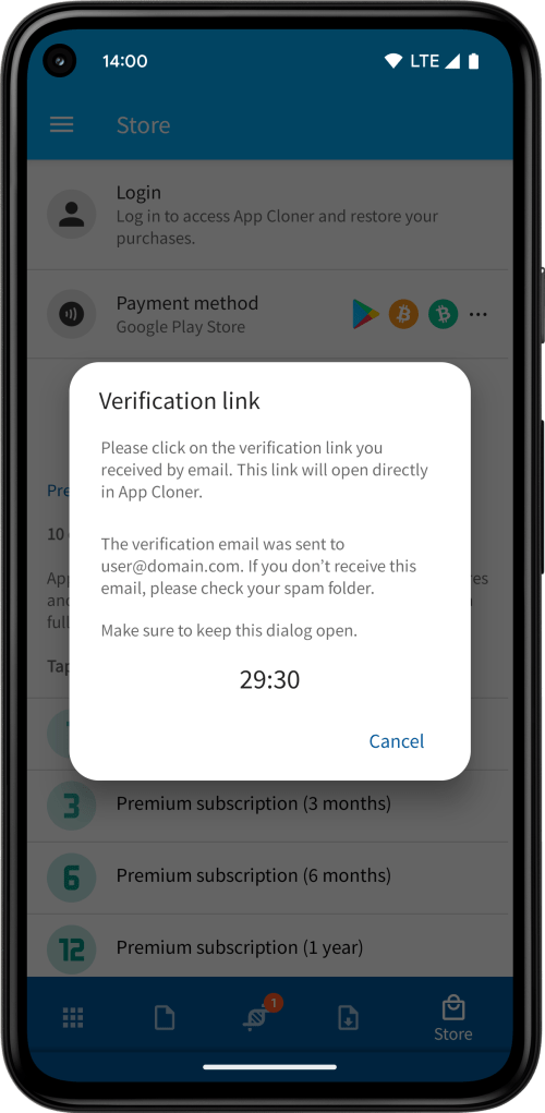 IMPORTANT: Keep the Verification link dialog open and avoid closing App Cloner while navigating to your email app or browser, as this will cancel the login process. Don’t swipe away App Cloner from the recent apps screen when switching to your email app as this will close App Cloner.