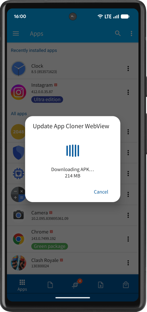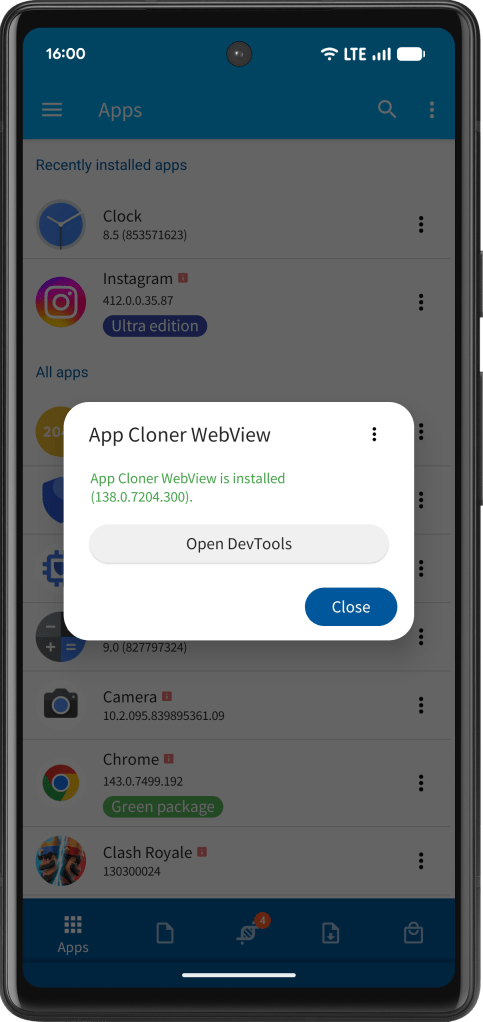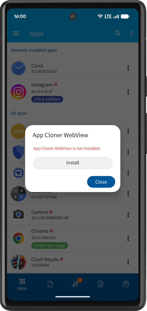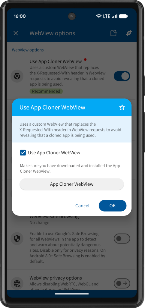 App Cloner 3.4 introduces the new App Cloner WebView, a custom Android System WebView component that can be installed without root access and lets cloned apps load their in-app WebView content through a dedicated App Cloner WebView.