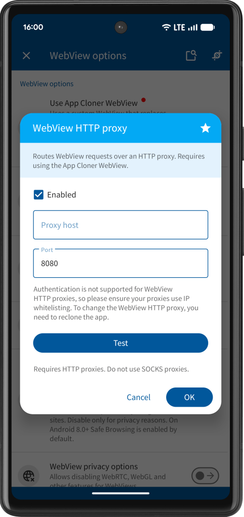 App Cloner 3.4 introduces a new WebView HTTP proxy option that works with the App Cloner WebView to route all WebView HTTP requests through an HTTP proxy.