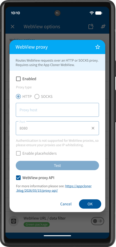 The WebView proxy API is available from App Cloner 3.4.6 onward.