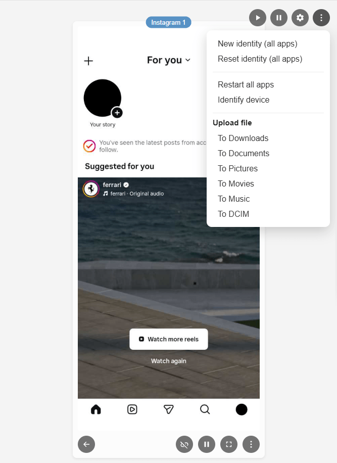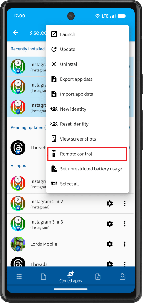 The Remote control feature allows you to view and interact with one or more cloned apps directly from a web browser, without needing to physically touch the device. You can send taps, swipes, keyboard input and clipboard content to your clones in real time, monitor their screens as a live stream and perform management actions such as restarting apps or generating new identities, all from a single browser interface.