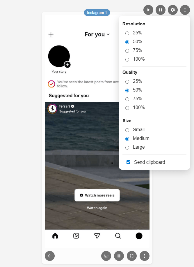 The Send clipboard option in the settings menu enables one-way clipboard synchronization from your browser to the Android device. When this option is enabled and a clone is active, pressing Ctrl+V (or Cmd+V on macOS) will transmit the text currently on your computer’s clipboard directly to the focused clone, where it is injected as if it had been pasted on the device itself.