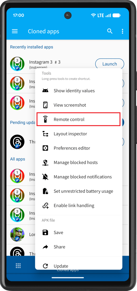 You can open a remote control session from the cloned apps screen by opening a clone’s pop-up menu or by multi-selecting several clones and using the context menu to open all of them together in a single session.
