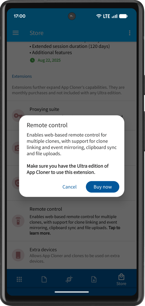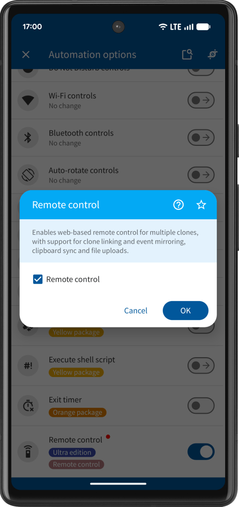 Remote control requires the Ultra edition of App Cloner and the Remote control extension. In addition, each clone you wish to control must have been created with the Automation option Remote control enabled at clone creation time; this option cannot be added retroactively to existing clones.